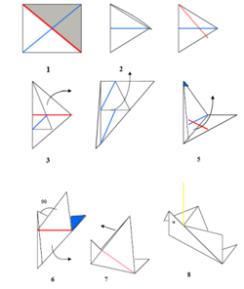 7. Fold both wings down along red line to make bird to look as if it is flying. Fold front point in to form bird’s head.